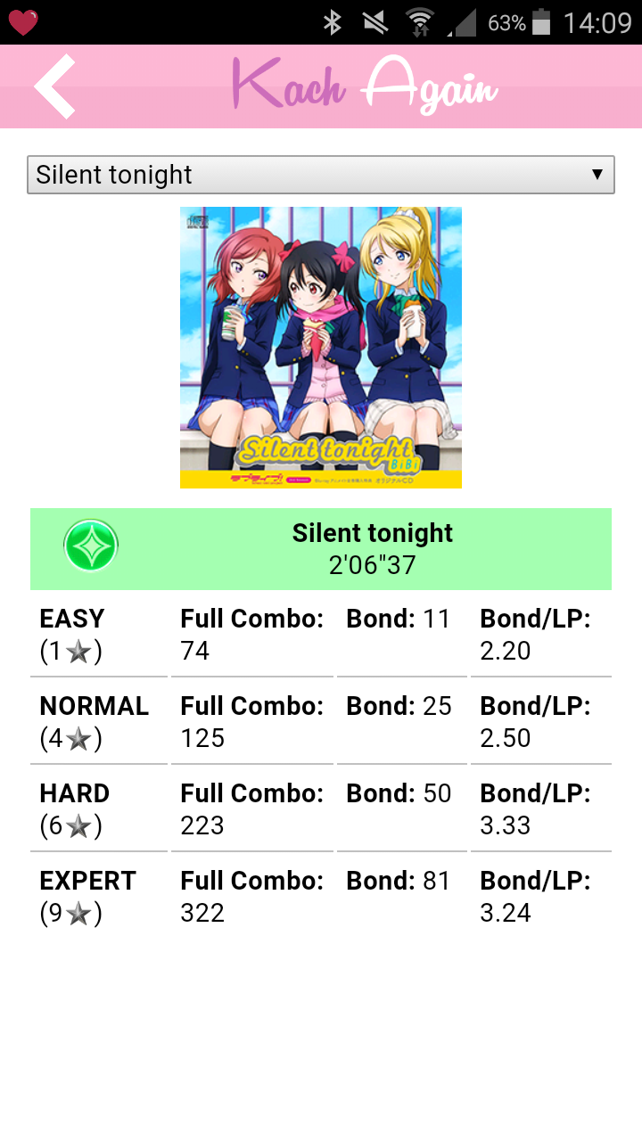 Now for what the app actually has: well, almost everything Kach Again has, without the things that are not prone to mobile viewing (for ex. list of assets, extracts, clean cards, song sorter), but even better (for some reason), as well as some new things, such as a song database and a card database - huge thanks to Triangle (sif.kirara.ca) for letting me abuse his bandwidth in order to use card data.
